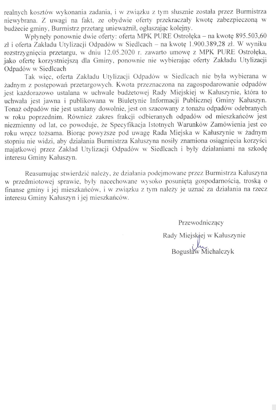 OŚWIADCZENIE NR 1/2022 RADY MIEJSKIEJ W KAŁUSZYNIE z dnia 10 czerwca 2022 r. w sprawie wyrażenia stanowiska w przedmiocie działań Burmistrza Kałuszyna